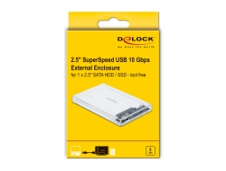 Toto plastové pouzdro od společnosti Delock lze použít k instalaci pevného disku nebo SSD 2.5” SATA. I přes tenkou konstrukci lze nainstalovat pevné disky výšky až 9,5 mm. Dodaný kabel USB Type-C™ na USB Typu-A umožňuje připojení k volnému zásuvkovému portu USB Typu-A. Průhledné pouzdro se stojanem Pevný, průhledný plastový kryt poskytuje pohled dovnitř, abyste ihned viděli, které paměti jsou uvnitř. Je dodáváno se stojanem pro provoz ve svislé poloze. Instalace HDD / SSD bez nástrojů Speciální funkcí tohoto pouzdra je, že k instalaci tohoto HDD není třeba nástrojů. Víko lze lehkým tlakem zatlačit zpět a SSD bude připojeno k portu SATA, načež bude víko připojeno zpět tak, že zapadne na místo. Specifikace • Konektor: externí: 1 x SuperSpeed USB 10 Gbps (USB 3.2 Gen 2) USB Type-C™ samice interní: 1 x SATA 6 Gb/s 22 pin samice • Vhodné pro 2.5” SATA HDD / SSD: výška HDD do 9,5 mm SATA HDD / SSD až do 6 Gb/s podporuje 5 V HDD / SSD HDD / SSD až do 4 TB • Chipset: VIA VL716 • Datová rychlost přenosu: SuperSpeed USB 10 Gbps, SuperSpeed USB 5 Gbps, Hi-Speed 480 Mbps, Full-Speed 12 Mbps, Low-Speed 1,5 Mbps • LED indikující napájení a přístup • Průhledný plastový kryt • Rozměry (DxŠxV): cca. 125 x 79 x 13 mm • Hot Swap, Plug & Play Systémové požadavky • Chrome OS 74.0 nebo vyšší • Linux Kernel 3.3 nebo vyšší • Mac OS 10.14.5 nebo vyšší • Windows 7/7-64/8.1/8.1-64/10/10-64 • PC nebo notebook s volným USB Typ-A portem Obsah balení • 2.5” externí pouzdro • Kabel USB-C™ samec na USB Typ-A samec, délka cca. 50 cm • Stojan • Uživatelská příručka Balení • Kartonová krabice |