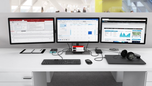 Kancelářská dokovací stanice USB-C, která podporuje až 2x externí monitor v rozlišení 4K. Stanice je kompatibilní s jakýmkoliv notebookem vybaveným portem USB-C nebo Thunderbolt 3. 6x USB port, spolehlivé a rychlé připojení do podnikové sítě díky integrovanému LAN portu a podpora instalace za monitor, to vše z této dokovací stanice dělá ideálního společníka pro profesionály. Samozřejmostí je podpora nabíjení vašeho notebooku či tabletu, a to až 100 W (napájecí adaptér je přiložen).