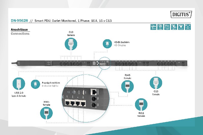 Optimální PDU řešení s možnostmi vzdáleného monitorování pro náročné IT požadavky Podporuje vzdálený přístup přes web, SNMP nebo Telnet Monitorování vstupních a výstupních hodnot Konfigurovatelný systém s uživatelem definovaným nastavením prahové hodnoty Daisy řetězení možné až pro 5 PDU 180 stupňový otočný místní HD displej Podporuje funkce alarmu Monitorování prostředí racku pomocí volitelných externích senzorů Inteligentní integrace do centrálního systému Podporuje instalaci bez použití nástrojů DIGITUS® Smart PDU vám nabízí možnost vzdáleného sledování proudu, napětí, celkové spotřeby energie, celkového výkonu a výkonu na vstupní úrovni, jakož i aktuální, napájecí a energetické spotřeby na výstupní úrovni. Limitní hodnotu lze nastavit pro celkový proud a alarm vás upozorní na potenciální přetížení systému. Je také povoleno sledování provozního stavu, stejně jako proudu, energie a výkonu na úrovni jističe. To umožňuje efektivní správu a distribuci energie. K zařízení lze přistupovat a konfigurovat je prostřednictvím webových, SNMP a Telnetových rozhraní. S možností připojení senzorů může jednotka obsahovat kompletní systém monitorování prostředí pro řízení teploty, kouře, vlhkosti a netěsností v regálech. Až pět napájecích proužků, které sdílejí stejné síťové připojení a IP adresu, lze připojit sériově. Kromě toho lze PDU snadno integrovat do regálů s možnostmi instalace bez nástrojů. Technické detaily Monitorování vstupního proudu / napětí / celkové spotřeby energie / celkový výkon / výkonový faktor Sledování výstupního proudu / celkové spotřeby energie / celkového výkonu Metoda vzdáleného přístupu: Webové rozhraní, HTTP, HTTPS, SNMP (v1 / v2c / v3), Telnet a sériová konzole Řetězení daisy až pěti PDU (včetně hlavního zařízení) Vícestupňový přístup uživatelů Kompatibilní se senzory teploty/vlhkosti/kouře/netěsnosti Uživatelsky definovaný alarm: E-mailové oznámení a poplašný signál při překročení prahových hodnot pro celkový proud, teplotu / vlhkost Standardní systémový alarm: Pokud je překročen celkový jmenovitý výkon; pokud je detekován kouř, voda nebo otevřené dveře Připojení RJ45 pro Ethernet a sériovou komunikaci USB Port pro přístup k WIFI nebo upgrade softwaru Síťový kabel: 3 x 2,5 mm2, IEC60309 16 Zástrčka Kabel: 3 m Max. zatížení: 4000 W / 250 V AC / 16 A (50/60 Hz) Zásuvky: zásuvka 16 x C13 Výstupní výkon: C13 (10A) 180 stupňový otočný HD displej Rozměry (LxWxD): 1730 x 66 x 52 mm Teplotní rozsah (provoz / skladování): 0 °C až +45 °C/ -20 °C až +70 °C Rozsah vlhkosti (provoz / skladování): 5% - 95% RH / 5 - 95% RH (nekodenzace) Maximální výška nad mořem (provoz / skladování): 0 - 3 000 m / 0 - 15 000 m Barva: Černá Typ ochrany: IP44 Obsah balíčku 1 x Smart PDU, zásuvka monitorovaná, 1fázová, 16 x C13, 3 m kabel IEC 60309 16 Zástrčka |