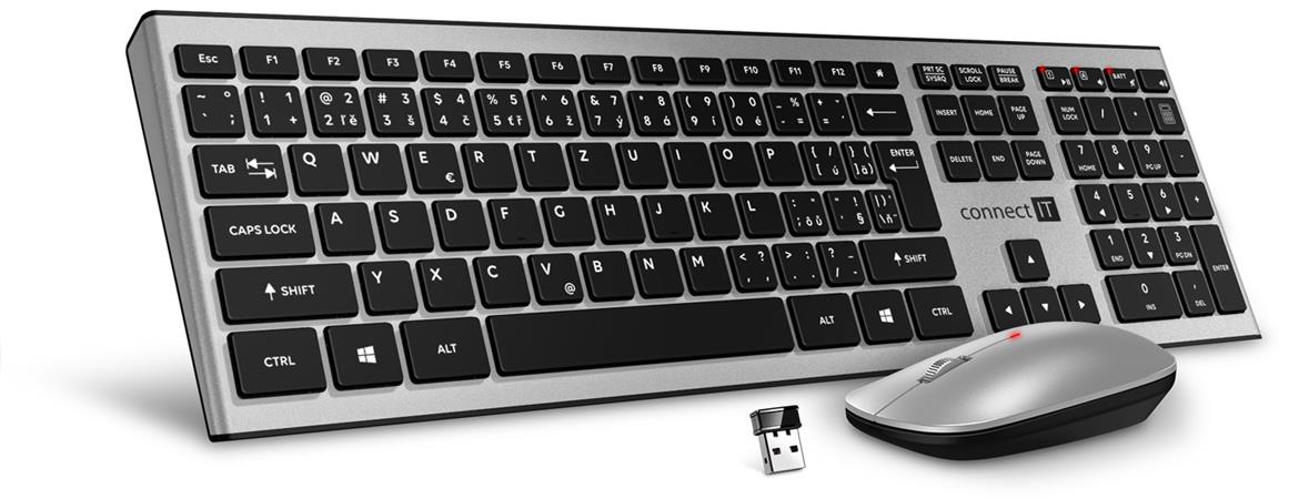 CONNECT IT Combo bezdrátová stříbrná klávesnice + myš, (+2x AAA +1x AA baterie zdarma), CZ + SK layout