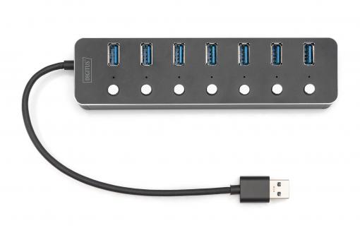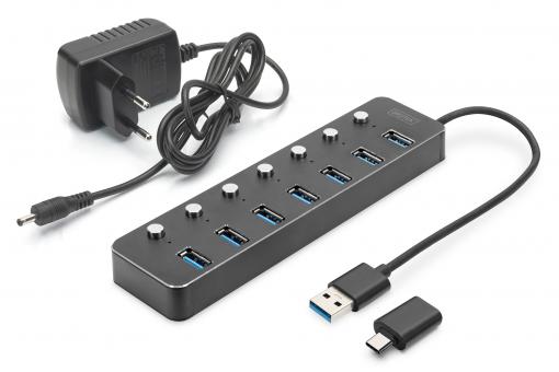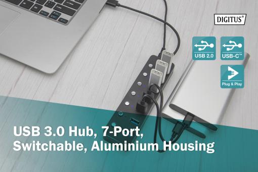 Rozbočovač USB 3.0, 7 portů, přepínač Hliníkové pouzdro, včetně zdroje 5V/2A