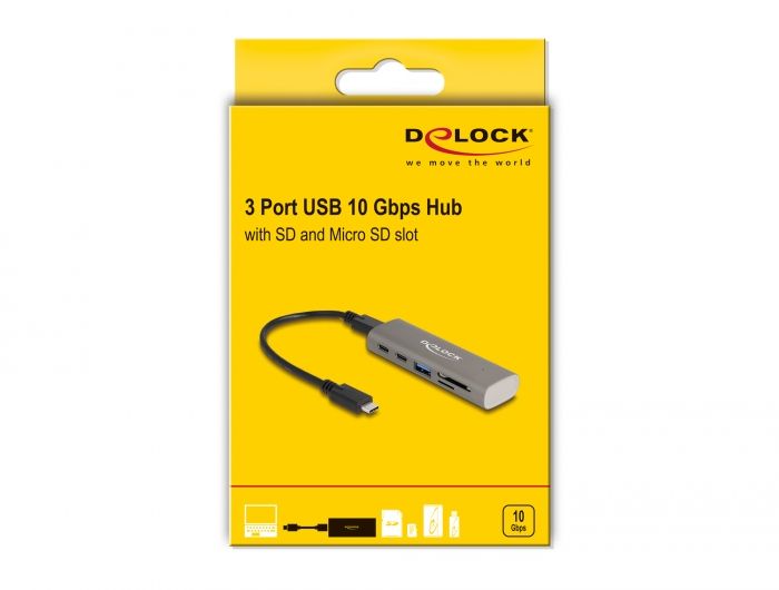 Tento pevný USB rozbočovač značky Delock s kovovým krytem lze připojit k počítačovému laptopu nebo mobilnímu zařízení. Rozšiřuje počítač o dva porty USB Type-C™ a o jeden port USB Typu-A. Lze připojit různá zařízení USB, jako například USB flash paměť, čtečku karet, externí pouzdro atd. Integrovaná čtečka karet Kromě toho rozbočovač s integrovanou čtečkou karet rozšiřuje PC nebo laptop o jeden slot pro kartu SD a Micro SD. Podporuje USB 10 Gbps Maximální dosahovaná datová přenosová rychlost je až dosáhnout lze 10 Gbps. Malý odolný pomocník Vzhledem ke svým malým rozměrům a pevnému krytu je tento rozbočovač Delock Hub obzvlášť vhodný na cesty. Lze jej prostě zabalit do tašky společně s laptopem nebo tabletem a dle potřeby jej používat. Specifikace Konektor: 3 x USB 10 Gbps USB Type-C™ samice 1 x USB 10 Gbps Typ-A samice 1 x SD slot 1 x Micro SD slot Chipset: VIA VL822 Rychlost přenosu dat 10 Gbps 1 x LED indikující Robustní kovové pouzdro Možnost bootování Plug & Play Barva: šedá Rozměry (DxŠxV): cca. 98 x 39 x 22 mm Systémové požadavky Android 11.0 nebo vyšší Chrome OS Linux Kernel 5.15 nebo vyšší Mac OS 12.4 nebo vyšší Windows 8.1/8.1-64/10/10-64/11 iPad Air (4-mé generace) nebo vyšší iPad Pro (3-mé generace) nebo vyšší Surface Pro 7 Zařízení s volným portem USB Type-C™ nebo volný port Thunderbolt™ 3 nebo Zařízení s volným portem USB4™ nebo volný port Thunderbolt™ 4 Obsah balení Hub USB 10 Gbps Kabel USB-C™ samec na USB-C™ samec, délka cca. 20 cm Uživatelská příručka Balení Kartonová krabice |