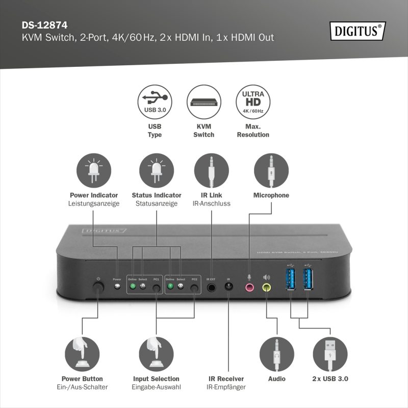 DIGITUS® 2-Port KVM Switch je vysoce výkonný HDMI-KVM přepínač. Směruje video s vysokým rozlišením (ve více rozlišeních až do 4kx2k@60Hz) a zvuk z kteréhokoli z několika zdrojů do zobrazovacích jednotek. Tento přepínač HDMI-KVM má nejen funkci přepínání stisknutím tlačítka, ale má také inteligentní funkci a také funkci připojitelnou za provozu.