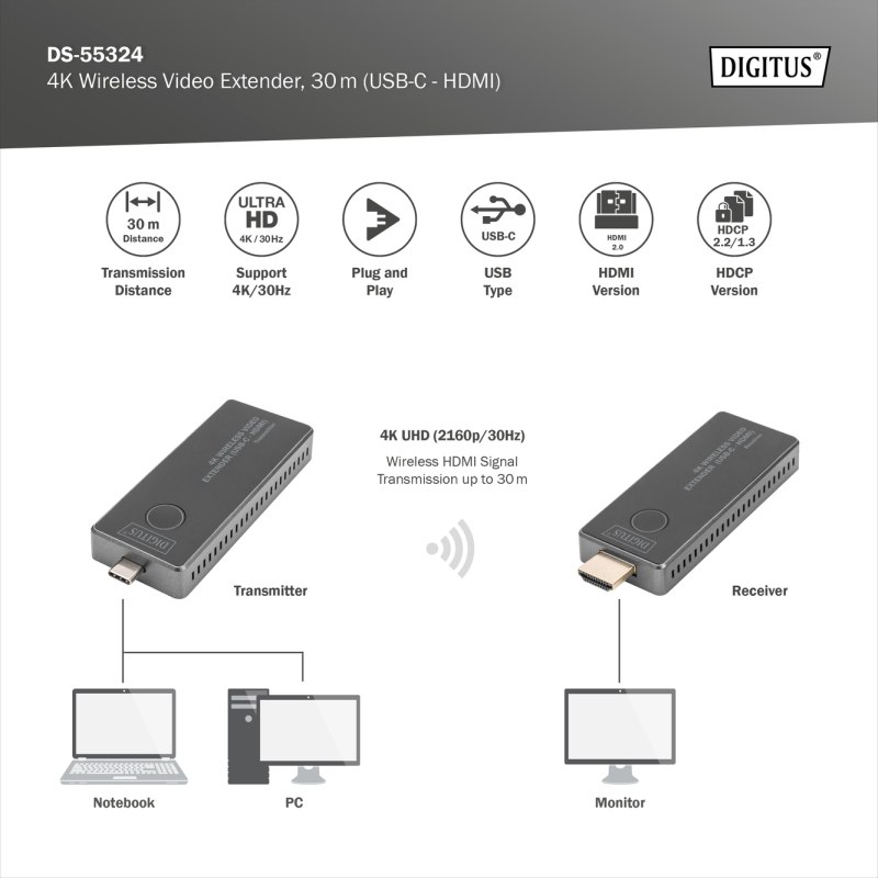4K bezdrátový AV Extender Set, 30 m USB-C - HDMI