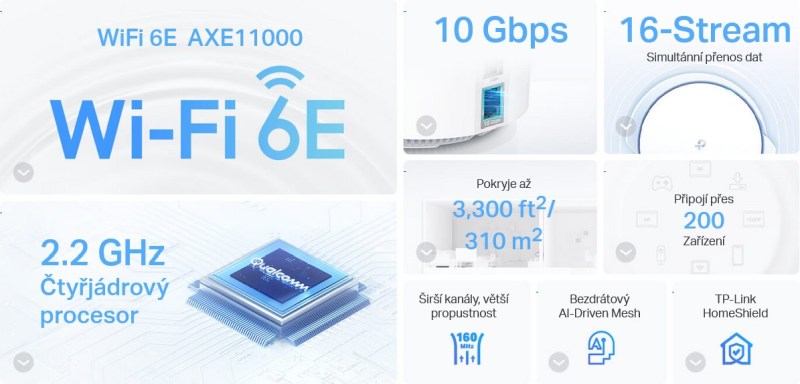 Klíčové vlastnosti Tři pásma: 4804 Mbps (5 GHz) + 4804 Mbps (6 GHz) + 1148 Mbps (2,4 GHz) Podpora 802.11a/b/g/n/ac/ax (Wi-Fi 6E), 4×4 MU-MIMO ve všech pásmech Spojení Meshových jednotek přes WiFi, případně přes ethernet Operační módy AP Router a Access Point Podpora šifrování WPA3 Podpora IPv6 (1) 100M/1G/10Gbps LAN/WAN + (2) 10/100/1000 Mbps LAN Systém Mesh s umělou inteligencí: Inteligentní analýza síťového prostředí zajistí ideální pokrytí Wi-Fi šité na míru vaší domácnosti Inteligentní antény: Silnější signál zvýší míru pokrytí a zlepší bezdrátovou konektivitu Nastavení snadné jako nikdy dříve: Aplikace Deco vás provede nastavením krok za krokem Bezproblémový roaming s jedním názvem Wi-Fi TP-Link Mesh znamená, že jednotky Deco spolupracují na vytvoření jedné jednotné sítě. Váš telefon nebo tablet se automaticky připojí k nejrychlejší jednotce Deco, když se pohybujete doma a vytváří skutečně bezproblémový Wi-Fi zážitek. Kompatibilita a snadná rozšířitelnost Veškeré jednotky Deco jsou spolu kompatibilní. V případě, že používáte více druhů jednotek, použijte jako hlavní (nejblíže internetu) tu nejlepší. Pokud potřebujete rozšířit vaši síť, jednoduše přikupte další jednotku Deco a přes aplikaci adoptujte do vaší stávající sítě. Obsah balení (2) Zařízení (2) Napájecí kabel Patch kabel Technické parametry Bezdrátové vlastnosti Bezdrátové frekvence:2.4 + 5 + 6 GHz (triple band) WiFi standardy:802.11ac, 802.11ax, 802.11n, 802.11a, 802.11b/g MU-MIMO:Ano Přenosová rychlost - 5GHz [Mb/s]:4804 Přenosová rychlost - 2.4GHz [Mb/s]:1148 Přenosová rychlost - 6GHz [Mb/s]:4804 Vysílací výkon 2.4GHz [dBm]:20 Vysílací výkon 5GHz [dBm]:23 Vysílací výkon 6GHz [dBm]:23 Šifrování:WPA, WPA2, WPA3 2.4GHz MIMO:4 x 4 5GHz MIMO:4 x 4 6GHz MIMO:4 x 4 Typ antény:Vestavěná Počet vestavěných antén:16 Roaming:Ano Konektory a rozhraní Rychlost LAN:(1) 100M/1G/10Gbps + (2) 10/100/1000Mbps Gigabit LAN:Ano Slot na SIM kartu:Ano Počet SIM slotů:1 Fyzické charakteristiky Provedení:Desktop Použití:Vnitřní Tlačítka:Reset Provozní teplota [°C]:0 až 40 Šířka [mm]:130 Výška [mm]:241 Hloubka [mm]:124 Software Operační mód:AP Router, Access Point Podpora IPv6:Ano |