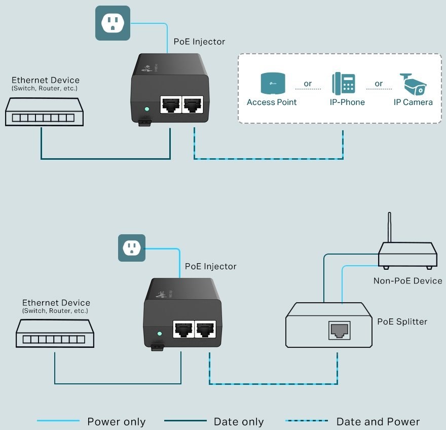 TL-POE160S je velmi robustní Gigabitový napájecí PoE+ injektor, který podporuje 802.3af/at standardy s výkonem až 30W, což je vhodné řešení pro napájení většiny IP kamer s podporou PoE, VoIP, WiFi AP a dalších zařízení. Injektor má LED indikaci, 3-pinový napájecí konektor na 230V a dva RJ-45 porty z nichž první je určen na DATA a druhý na DATA + napájení.