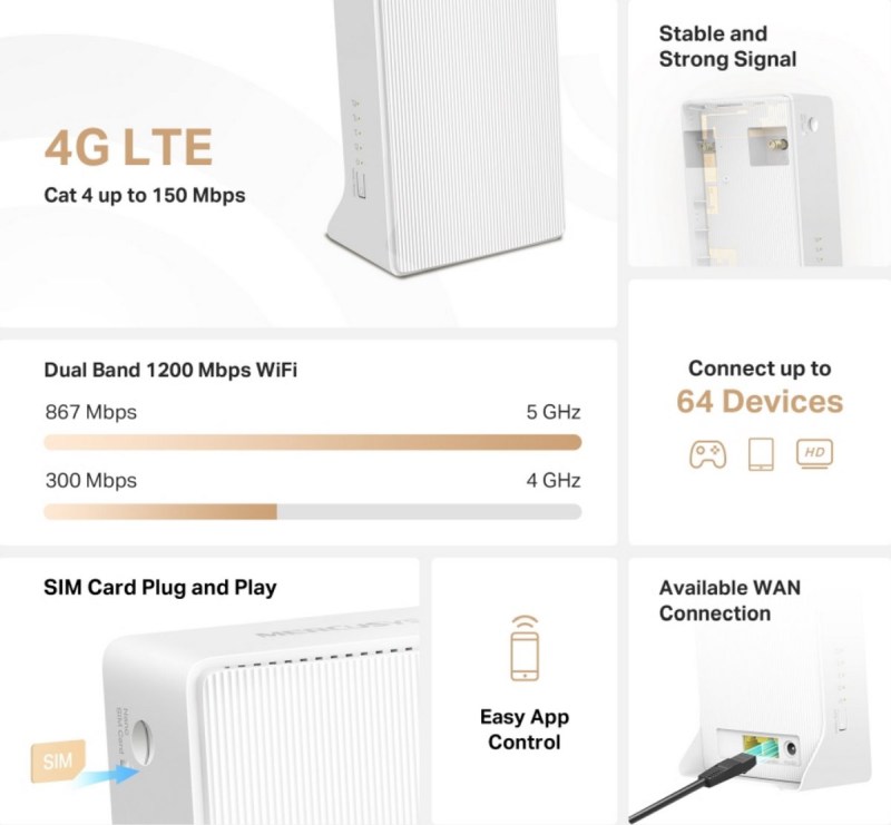 Využívejte internet naplno kdekoliv s 4G LTE routerem Mercusys MB130-4G, který Vás připojí k LTE síti rychlostí až 150Mbps download a 50Mbps upload. Pro zajištění stabilního mobilního připojení umožňuje router připojení externích 4G LTE antén. Sdílet internet na více zařízení můžete prostřednictvím dual-band WiFi5 s rychlostí až 867Mbps v 5GHz pásmu a 300Mbps v 2,4GHz pásmu. K routeru můžete připojit další zařízení pomocí 2xLAN portů, z nichž jeden dokáže sloužit i jako WAN port pro připojení kabelového připojení. V případě využití více druhů připojení zajistíte maximální dostupnost vašeho internetového připojení, kdy v případě výpadku kabelového připojení, router přepne na LTE.