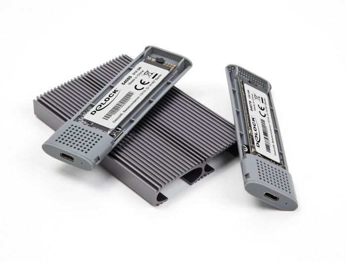 Toto pouzdro značky Delock umožňuje instalaci dvou SSD M.2. Používat a provozovat lze buďto SSD M.2 PCIe NVMe nebo SSD M.2 SATA ve formátech 2280, 2260, 2242 a 2230. Robustní kovový kryt s chladicími lamelami zajišťuje optimální teplotu paměti. Kombo pouzdro Velkou výhodou tohoto krytu Delock M.2 je, že do pouzdra lze vložit jak disky SATA, tak i PCIe (NVMe) M.2 SSD. Paměť bude automaticky rozpoznána čipovou sadou a pak ji bude lze používat. Instalace SSD bez nástrojů Speciální funkcí tohoto pouzdra je, že k instalaci SSD M.2 není potřeba žádných nástrojů. Vnitřní díl lze vytáhnout stlačením tlačítka, načež bude SSD vložen do slotu a přitlačen gumovou spojkou k desce. Technické detaily Konektor: externí: 2 x USB 10 Gbps USB Type-C™ samice interní: 2 x M.2 klíč M slot Chipset: Realtek RTL9210B Podporuje M.2 moduly ve formátu 2280, 2260, 2242 a 2230 s klíčem M nebo klíčem B+M na základě SATA nebo PCIe (NVMe) Maximální výška komponentů na modulu: 1,5 mm je podporována aplikace oboustraných modulů Podporuje NVM Express (NVMe) Možnost bootování Rychlost přenosu dat 10 Gbps 2 x LED indikující napájení a přístup Kovová skříňka Rozměry (DxŠxV): cca. 110 x 74 x 13 mm Hot Plug, Plug & Play Systémové požadavky Android 10.0 nebo vyšší Chrome OS Linux Kernel 5.11 nebo vyšší Mac OS 11.2.3 nebo vyšší Windows 10/10-64/11 iPad Air (4-mé generace) nebo vyšší iPad Pro (3-mé generace) nebo vyšší Surface Pro 7 Zařízení s volným portem USB Type-C™ nebo volný port Thunderbolt™ 3 nebo Thunderbolt™ 4 nebo Jeden volny USB Typ-A port Obsah balení Externí pouzdro M.2 2 x Kabel USB-C™ samec na USB-C™ samec (s adaptérem na USB Typu-A samec), délka cca. 45 cm 2 x tepelně vodivé podložky 2 x tepelně vodivá destička 4 x gumová špička Uživatelská příručka Balení Kartonová krabice |