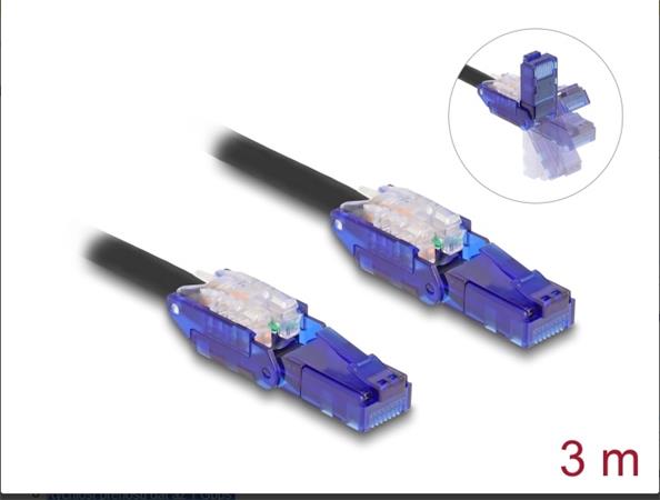 Tento síťový kabel od Delocku může být použit pro připojení různých síťových zařízení, např. NIC ke switchi nebo patch panelu. Šroubky konektoru zabezpečí spojení a zabrání náhodnému odpojení kabelu. S výklopnými zástrčkovými konektory (180°) Konektory mohou být vyklopeny o 90° nahoru nebo dolů. Umožňují také prostorově úspornou instalaci do úzkých prostor. Technické detaily Konektor: 1 x RJ45 samec 90° pravoúhlý nahoru / dolů 1 x RJ45 samec 90° pravoúhlý nahoru / dolů 1:1 spojení Cat.6 specifikace Rychlost přenosu dat až 1 Gbps Šířka pásma: 250 MHz Nestíněný (UTP) Průřez kabelu: 24 AWG Zlacené konektory: 50 u” Průměr kabelu: cca. 6,0 mm Materiál obalu kabelu: LSZH (bez halogenů) Provozní teplota: -20 °C ~ 60 °C Barva: černá Délka: cca. 3 m Obsah balení RJ45 kabel Balení Plastová taška se zipem |