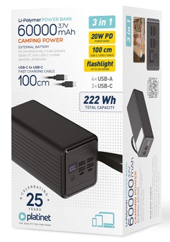 "PMPB4065 je vysokokapacitní power banka, která nabízí rychlé a efektivní napájení elektronických zařízení. S obrovskou kapacitou 60 000 mAh při 3,7 V (ekvivalent 44 400 mAh při 5 V) můžete své smartphony, tablety a další mobilní zařízení dobít několikanásobně, než budete muset powerbanku znovu připravit k použití.