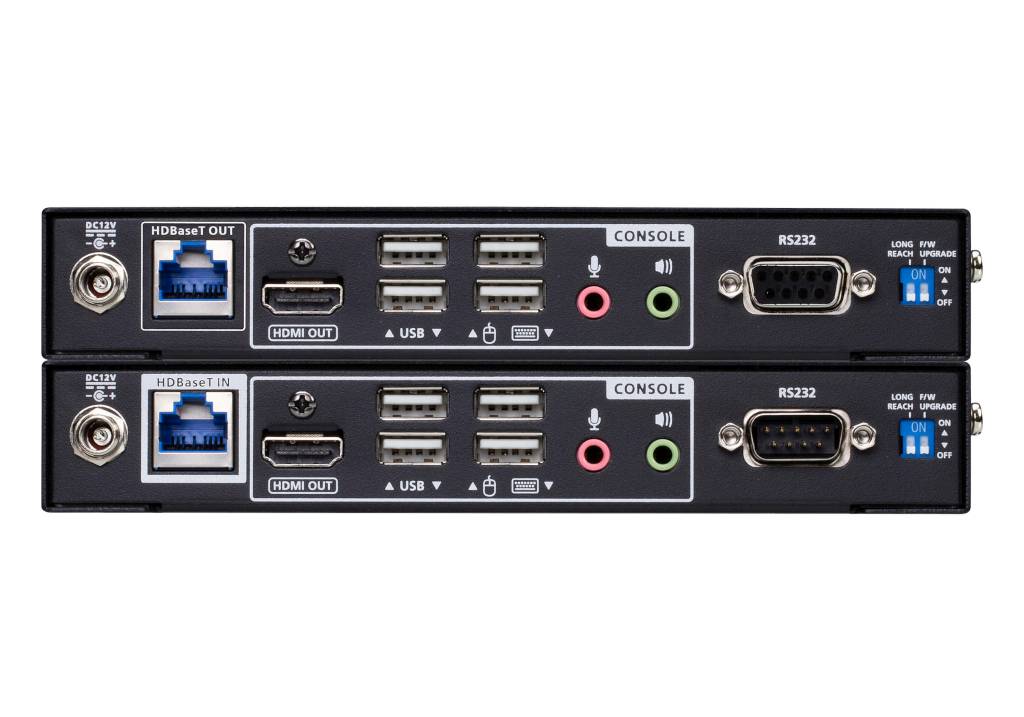 CE840 USB True 4K HDMI HDBaseT 3.0 KVM Extender využívá nejnovější technologii HDBaseT 3.0 a skládá se z místní jednotky a vzdálené jednotky, což umožňuje nekomprimovaný přenos signálu True 4K HDMI, zvuku, RS232, Ethernetu a USB přes 100 m přes jediný kabel Cat 6A (doporučuje se kabel ATEN 2L-29330 Cat 6A) nebo vyšším. Instalace je snadná, přehledná a nákladově efektivní bez kompromisů v oblasti vysoce kvalitní distribuce AV obsahu. CE840 umožňuje provoz dvou konzolí prostřednictvím dvou portů USB pro připojení klávesnice a myši USB a tlačítek pro přepínání ovládací konzole USB mezi vzdáleným a místním koncem. LED diody na předním panelu indikují, který režim ovládání USB je aktuálně zapnutý. Každá jednotka navíc obsahuje výstupní port HDMI pro místní ovládání a další dva porty USB 2.0 pro připojení periferních zařízení USB. Díky tomu mohou operátoři získávat data a spravovat zařízení na jednom místě, a to i na dálku.