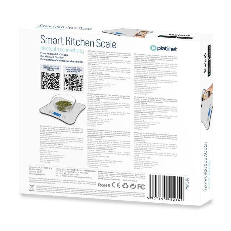 Umožňuje vám sledovat hmotnost, kalorie a živiny produktů pomocí připojení Bluetooth k mobilní aplikaci ve vašem smartphonu. KLÍČOVÉ VLASTNOSTI Připojení Bluetooth Mobilní aplikace Výpočet kalorií a živin Čitelný LCD displej Historie jídla JEDNODUCHÝ PROVOZ 1. Zapněte mobilní aplikaci, vyberte příslušný produkt/pokr a poté jej postavte naváhu. 2. Na základě údajů o hmotnosti a aplikaci budou vypočteny hodnoty kalorií a živin. 3. Data budou archivována v paměti aplikace. Pečujte o své zdraví Účinná a efektivní strava vyžaduje nejen kontrolu hmotnosti, ale také kalorií a živin. Vědět, jaké složky vaše tělo potřebuje, může být pro vaše zdraví rozhodující. VYSOKÁ KVALITA A VÝKONNOST Výrobek splňuje všechny nezbytné požadavky, aby mohl přijít do styku s potravinami. Váha je vyrobena z vysoce kvalitního materiálu, který lze snadno očisti od nečistot z potravin - vše, co potřebujete, je vlhký hadřík. TECHNICKÁ SPECIFIKACE - Aplikační funkce: měření hmotnosti, kalorií, živin (tuk, bílkoviny, uhlohydráty, cholesterol, vláknina, sodík); - Maximální zatížení: 5000 g; - Přesnost: 1 g; - Měrná jednotka: g / ml / oz / lb. unce; - Mobilní aplikace: iOS, Android; - Informace o přetížení; - Automatické zapnutí a vypnutí; - LCD displej;" |