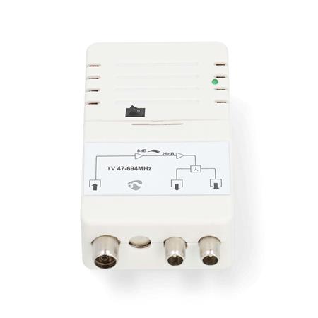 Zesílení: 25 dB | 47 - 694 MHz | Počet výstupů: 2 | Ovládání zesílení | Bílá • 2pásmový pokojový anténní zesilovač (25 dB) pro připojení dvou přijímačů (TV/Radio) • Ideální pro zesílení signálu a nastavení úrovně • Aktivní distribuce anténního signálu 47 - 694 MHz • Ovládání zisku - umožňuje sladit vstup zesilovače s výstupem zdroje • S filtrem LTE-700 pro snížení dopadu 5G • Vstup: IEC zásuvka, výstup: dvě IEC zástrčky • S integrovaným napájecím zdrojem 230 V Specifikace produktu Šířka 70 mm Výška 39 mm Hloubka 125 mm Hmotnost 233 g Barva Bílá Materiál ABS Zinc Alloy Impedance 75 Ohm Vstupní proud 1.0 A Typ zdroje napájení Síťové napájení Délka kabelu napájecího adaptéru 1.50 m Počet výstupů 2 Zesílení 25 dB Počet vstupů 1 Typ příslušenství CATV Zesilovač CATV LTE Filtr LTE700 Vstupní napájecí konektor(y) Euro Ovládání zesílení 0-18 dB Typ konektoru IEC (Koax) Frekvenční rozsah 47 - 694 MHz Aplikace CATV Spotřeba elektrické energie v provozním režimu 2 W Strana napájecího kabelu A Euro Počet produktů v balení 1 kusů Vstupní napětí 230 V AC 50/60 Hz Šumové číslo 4 dB Výstupní úroveň 103 dBuV |