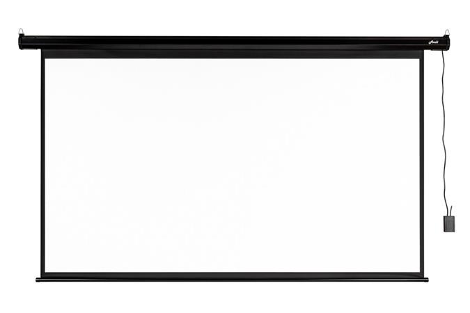 Projekční plátno roletové, rozměr 221 cm × 125 cm, úhlopříčka 100", poměr stran 16:9, matně bílé plátno, černé okraje, černé tělo, k umístění na strop a na zeď, motor pro navíjení, s dálkovým ovládáním