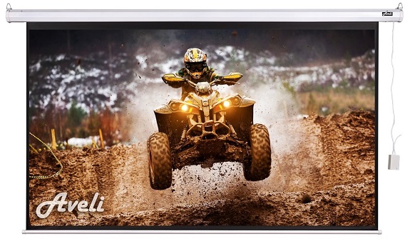 Projekční plátno roletové, rozměr 532 cm × 299 cm, úhlopříčka 240", poměr stran 16:9, matně bílé plátno, černé okraje, bílé tělo, k umístění na strop a na zeď, motor pro navíjení, s dálkovým ovládáním
