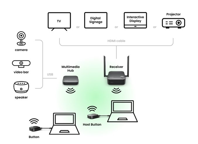 Podporuje BYOM pro hybridní schůzky od malých skupin až po velké místnosti Žádné nastavení: nejsou potřeba žádné aplikace, ovladače ani síť Řešení pro spolupráci BYOM a BYOD: pořádání videokonferencí odkudkoli Nulová latence: přehrávání videa v rozlišení 4K/60 fps a podpora dotykového ovládání Bezpečné připojení: šifrování s certifikací CVSS 4.0 Snadná správa: vyměnitelné zástrčky a správa v cloudu 4-dílné rozdělení obrazovky Až 4 prezentující mohou sdílet své nápady na jedinou obrazovku. Funguje s Windows, Mac, Chrome i Linuxem—ideální pro rychlé a efektivní multitasking Technické údaje Anténa (x2), 2 dBi Button (vysílač) (x1) Úložný stojánek (x1) Kabel HDMI (x1) Host (přijímač) (x1) Host Button (Transmitter) (x1) Multimedia Hub (x1) Napájecí adaptér (x2) Bezpečnostní informace (x1) InstaShow Tlačítko Button - typ konektoru USB typu C Funkční tlačítko Button Tlačítko rozdělení obrazovky InstaShow Host Host - napájení 3A, DC 12V±10% Host - normální spotřeba energie 15W LAN (RJ45) (x1) Výstup HDMI (x1) Host - rozměry bez antény 123x123x49.9mm Host - hmotnost 300 g Úložný stojánek InstaShow Úložný stojánek - rozměry 84.5x62.5x128mm Úložný stojánek - hmotnost 555 g Funkce InstaShow Pokročilý standard šifrování (Encryption) AES128 BYOD Apple OS/Android/windows BYOM Driver-Free Video conference Max. rozlišení výstupu (přijímač) Up to 1080p 60Hz (USB-C), Up to 4K 60Hz (HDMI) Souběžná připojení 64 TouchBack Yes Výstupy videa HDMI 2.0 (s HDCP), DP 1.2 (with HDCP) Chráněný přístup Wi-Fi WPA3 enterprise Standard WiFi 6 Bezdrátová rychlost přenosu dat (maximální) AX3000 (2.4G 574 Mbps + 5G 2400 Mbps) Bezdrátová frekvence 2,4 GHz + 5 GHz |
